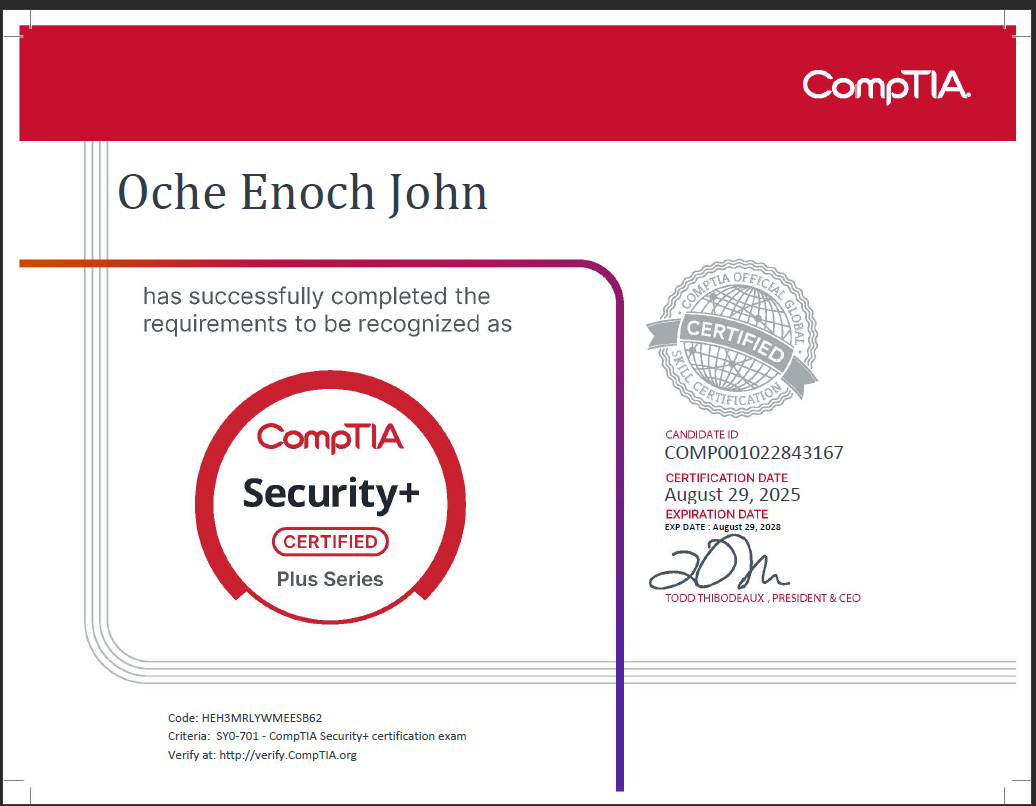 Hi, I’m John Enoch, a cybersecurity and network engineering enthusiast passionate about building secure, resilient systems. I specialize in threat detection, incident response, and network defense, combining my love for networking with the art of cybersecurity.