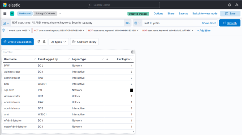winlog.logon.type.keyword) to understand how the failed attempts occurred.Sorted the table by # of logins in descending order to surface the most suspicious accounts first.